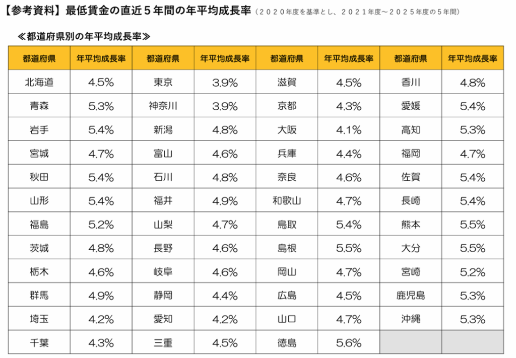 なお、各都道府県における最低賃金の直近5年間の年平均成長率は参考資料として中小企業省力化投資補助金の公式サイトに掲載されています。