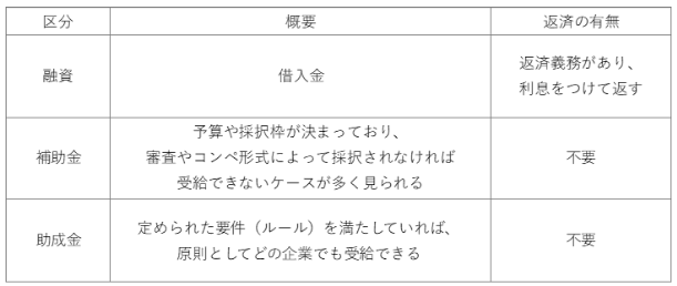 よく「補助金」や「融資」と混同されがちですが、その違いを整理すると以下のようになります。