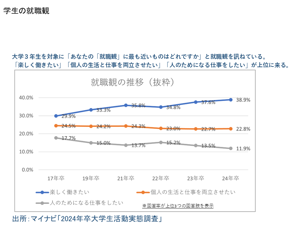 マイナビの調査した「2024年卒大学生活動実態調査」では、学生は「楽しく働きたい」「生活と仕事を両立したい」と考えています。