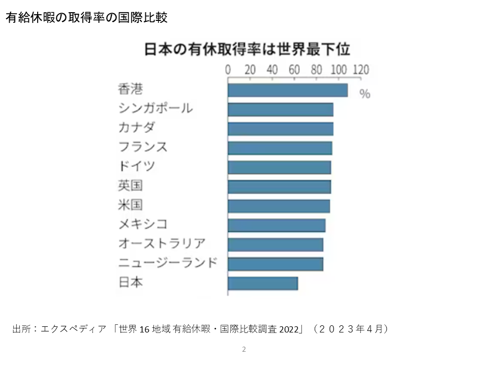 エクスペディアが2023年4月に発表した「世界 16 地域 有給休暇・国際比較調査 2022」によれば、世界の主要国の中で日本の有給取得率は63%であり、国際的にも低いです。日本も昔と比べれば、取得率は高くなってきましたが、世界はその上をいっています。